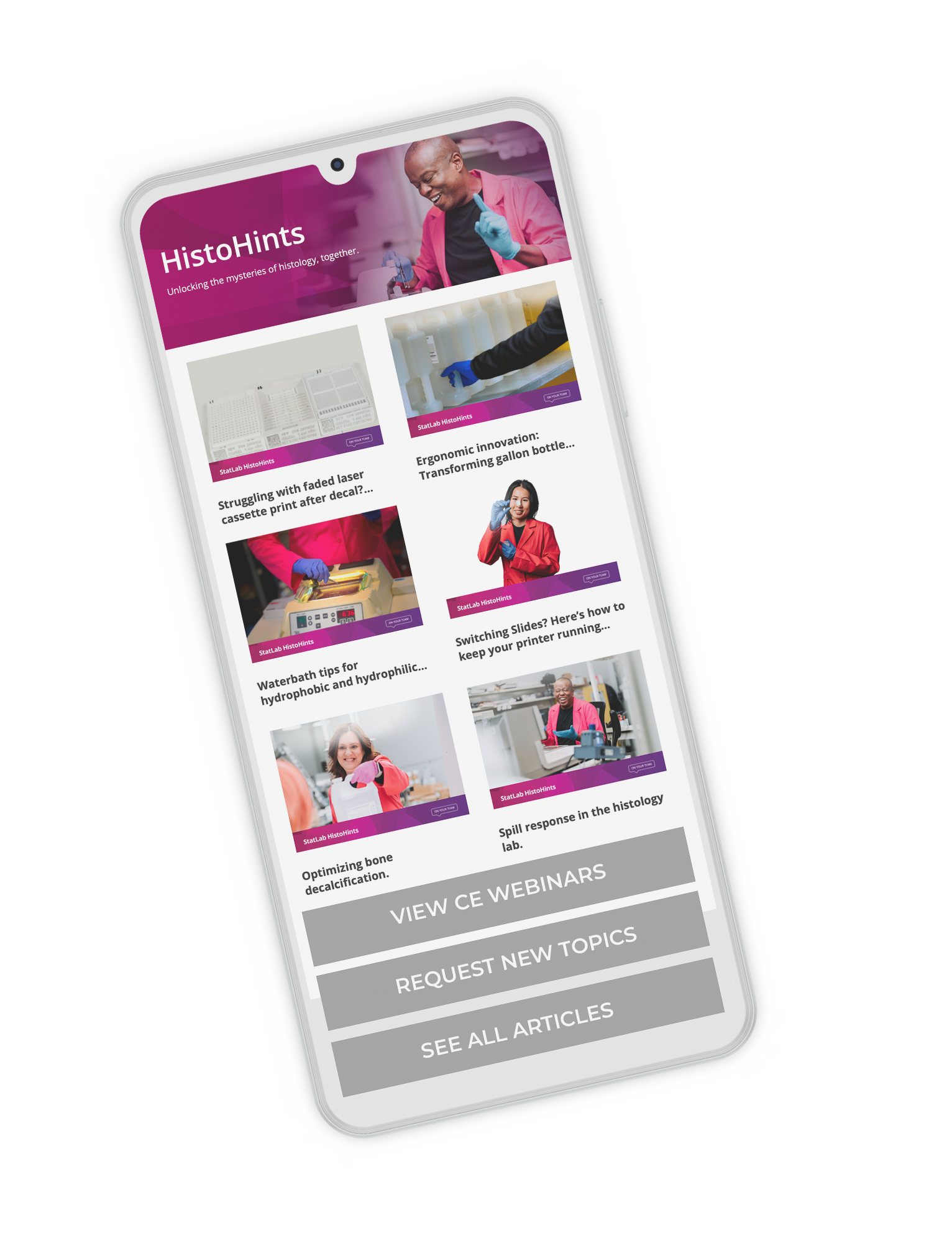lab staff with HistoHints: StatLab’s hub for trusted histology insights and CE credit webinars—accessible anytime, at no cost.
