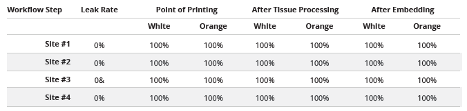 In addition to print and scan quality, we challenged cassettes with paraffin embedding to check for potential leaks. Each user embedded according to their standard workflow. We hypothesized that there would not be leaking however wanted to make sure that these were robust cassettes. Embedding molds tested included metal molds from StatLab, Simport, and Sakura. Plastic molds were tested as well. We noted a 0% leak rate across all cassettes.