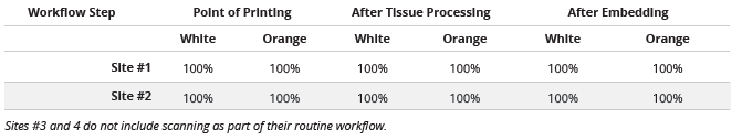 PiSmart cassettes were tested at 4 customer sites, including printing, processing, embedding, sectioning and overall usability. A total of 160 cassettes were tested at each point in the workflow. At each site, we compared 20 white cassettes manufactured at our UK manufacturing site to 20 orange cassettes manufactured at our US manufacturing site to ensure equivalency between sites and color variants.