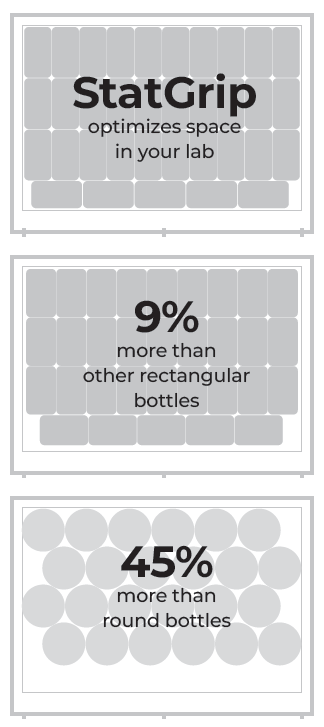 - Efficient. Allow labs to fit up to 45% more containers in a standard 90-gallon cabinet compared to round bottles, and 9% more than other rectangular options.